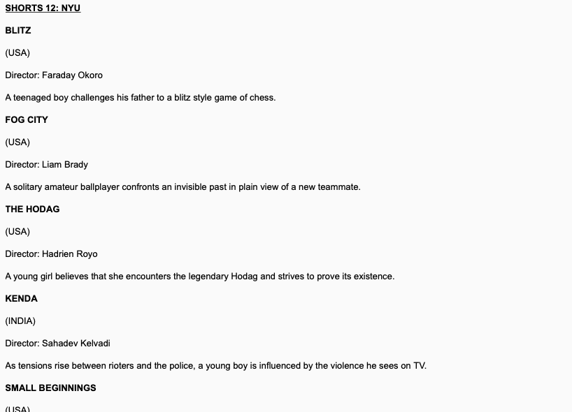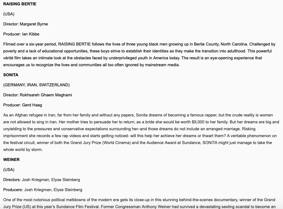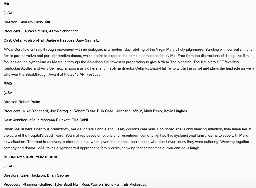 Excerpts from the film guide for the 2016 season of the Sarasota Film Festival. Copy includes RAISING BERTIE, MA, MAD, FOG CITY, & THE HODAG.